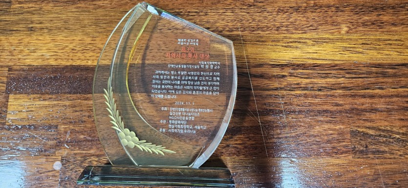 사랑나눔 장애인공동생활가정 박원경 시설장님이 지난2024년11월1일 제3회 지역사회봉사 대상을 수상하셨습니다! 공동생활가정 모든 식구들과 축하를 나누며, 수상 내용을 공유드립니다.